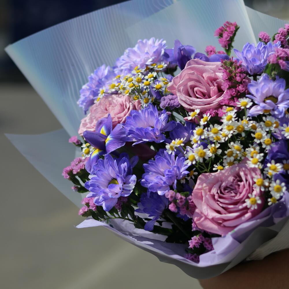 Этот дизайнерский букет из сиреневых розочек, очаровательного танацетума, ромашек и статицы, оформленный в стильной упаковке, станет настоящим источником вдохновения и радости. Нежные оттенки и разнообразие текстур создают гармоничное сочетаниедля девушки, жены, любимой, подруги. Подарите этот букет, и он станет символом ваших искренних чувств, наполняя каждый день светом и счастьем